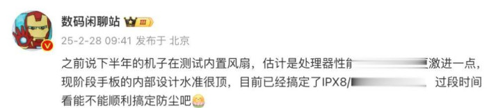 按照爆料中的说法,接下来有一台骁龙8 Gen5、一台天玑9500(+)、一台骁龙8 Elite Gen5新机在测内置风扇,全支持满级防水,理论上具备防尘能力,大概率明年上半年都能见到。