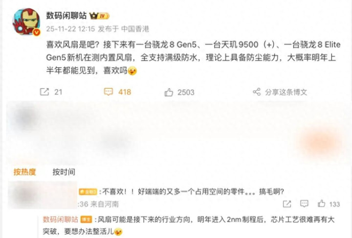 有网友在互动中表示“不喜欢!!好端端的又多一个占用空间的零件。。。”这位博主的回应则显示“风扇可能是接下来的行业方向,明年进入2nm制程后,芯片工艺很难再有大突破,要想办法整活儿”。