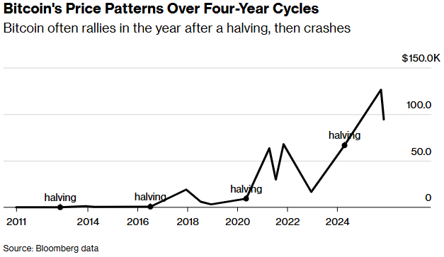 交易大厅和社交媒体上,焦虑情绪正在蔓延。交易员们反复查看旧的图表,重新拾起熟悉的理论,急切地寻找买家。由于没有关于比特币行为模式的传统华尔街范本——没有稳定的相关性,没有经过验证的风险框架——一些人便回归到他们最熟悉的模式:四年减半周期。